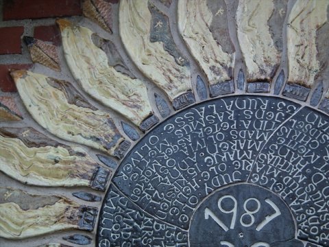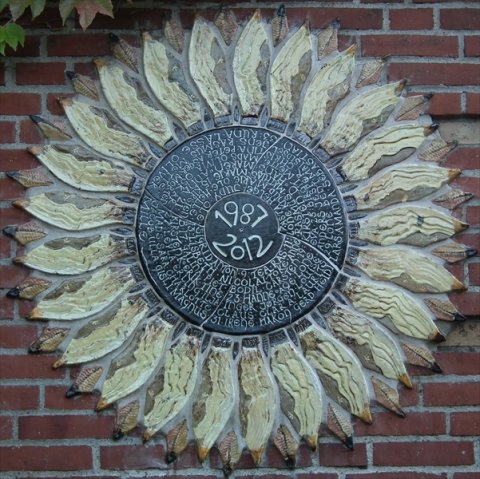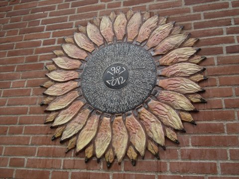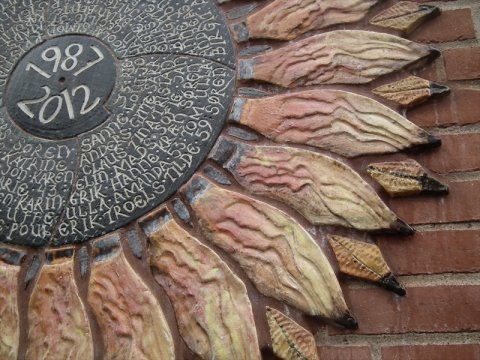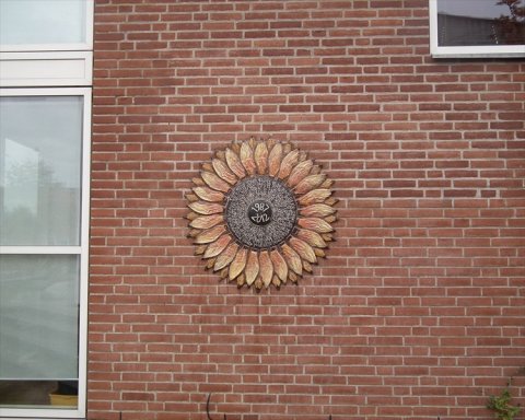 Solsikke på gavl i gårdrum |  Detalje af solsikke i gårdrum |  Solsikke på gavl i gårdrum